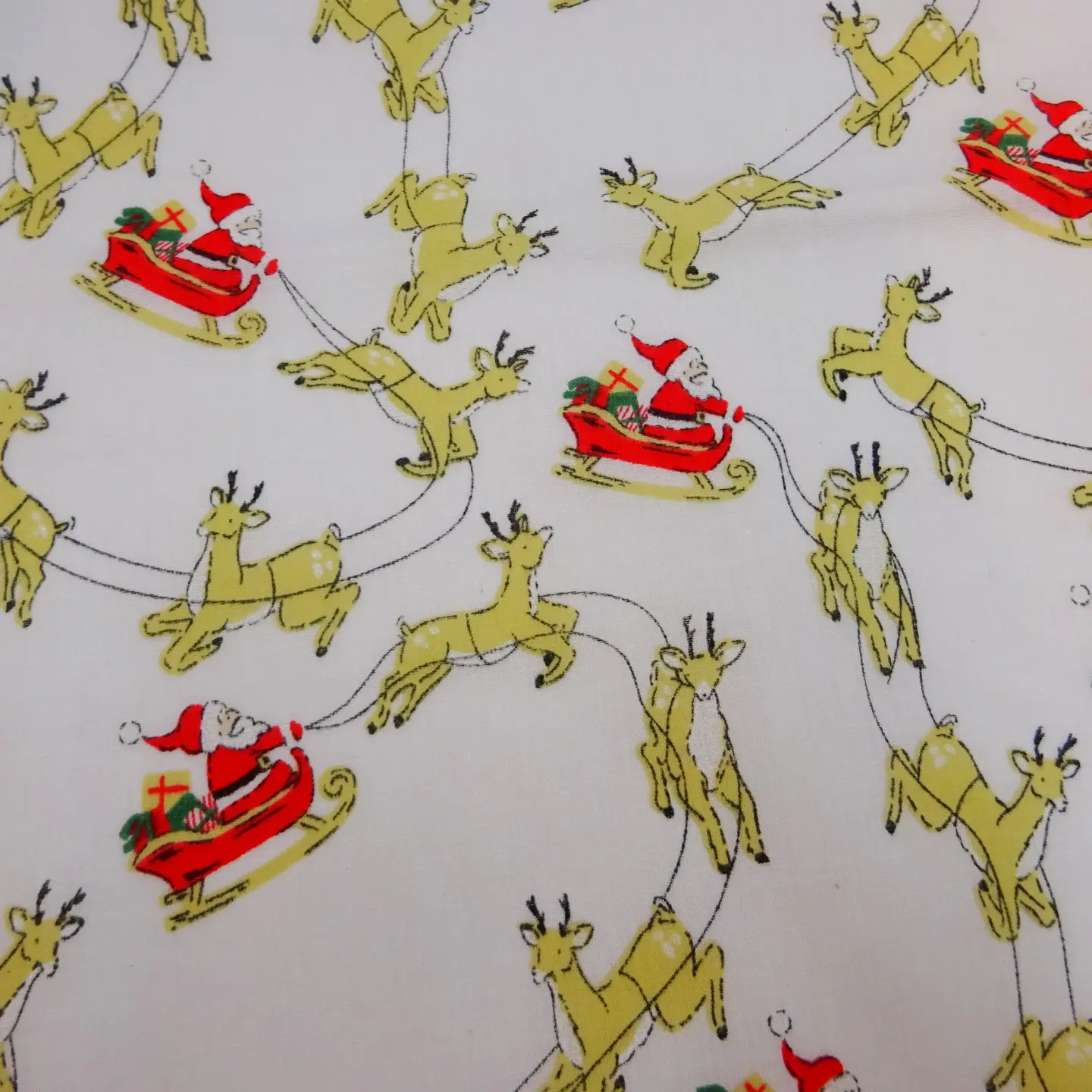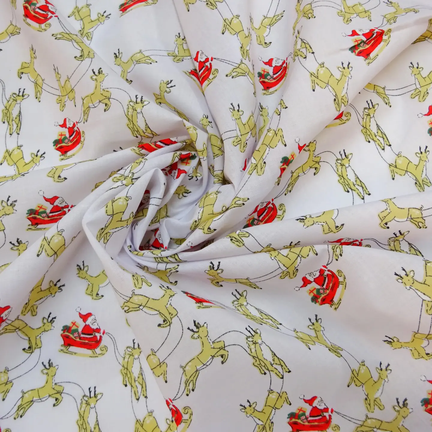 Christmas Polyester Cotton Fabric Dashing Reindeers is ideal for craft projects and clothing making. Available in green, red, navy, and white.
