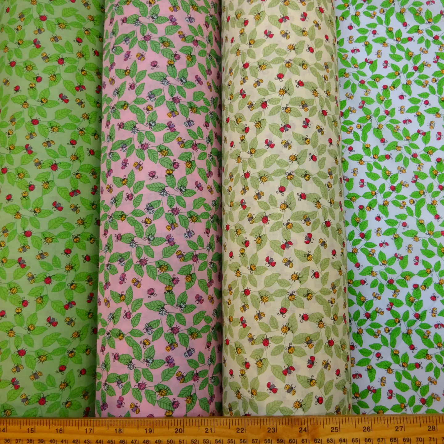 Polyester Cotton Fabric Lady Bird Fiesta is ideal for bunting, costumes, and children’s summer shirts, shorts, and hat combinations. Available in Blue, Cream, Green, and Pink.