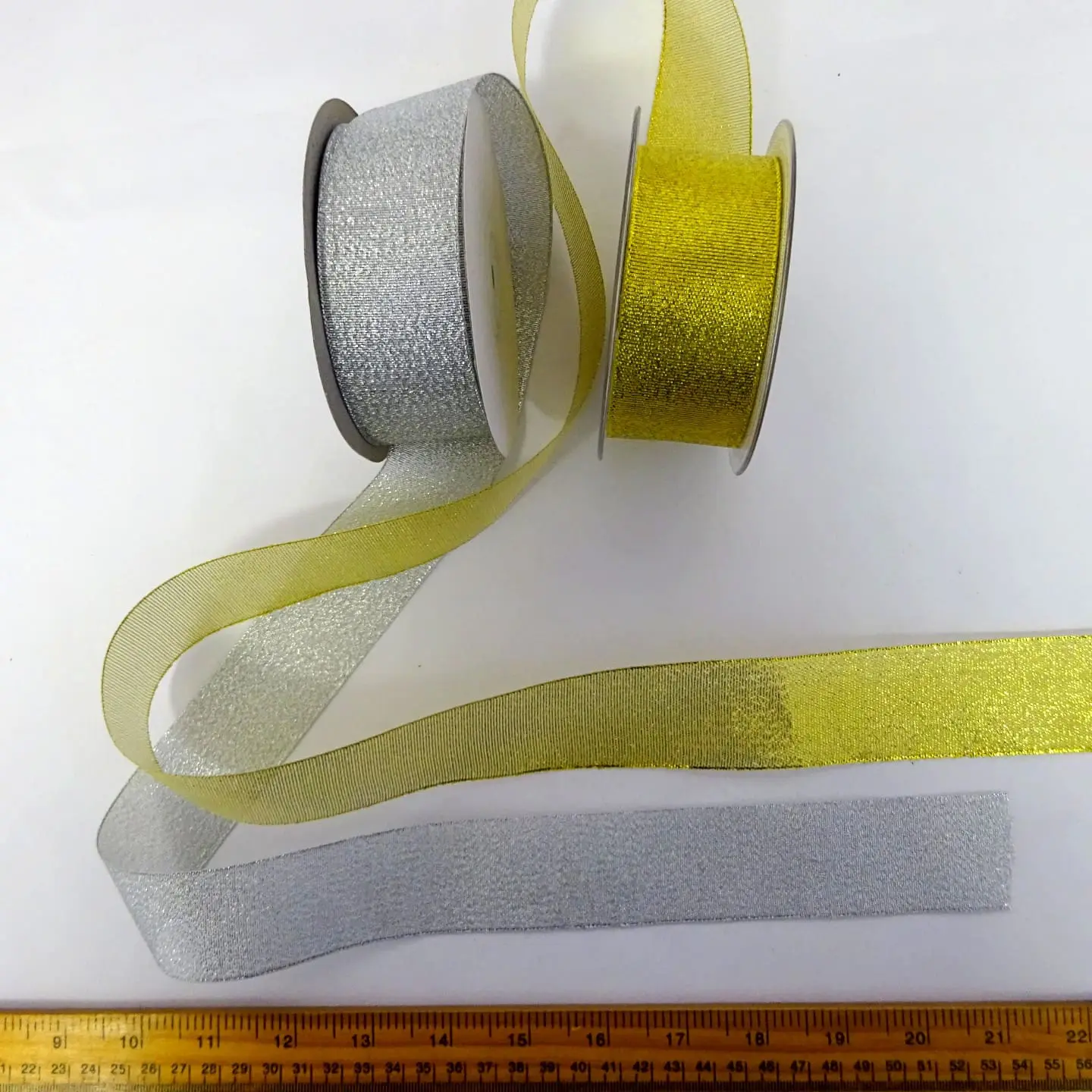 Ribbon 38mm Metallic is ideal for adding an extra sparkly touch to any craft project, such as Christmas wreath making, table decorating, tree decorating or even just gift wrapping. Available in gold and silver.